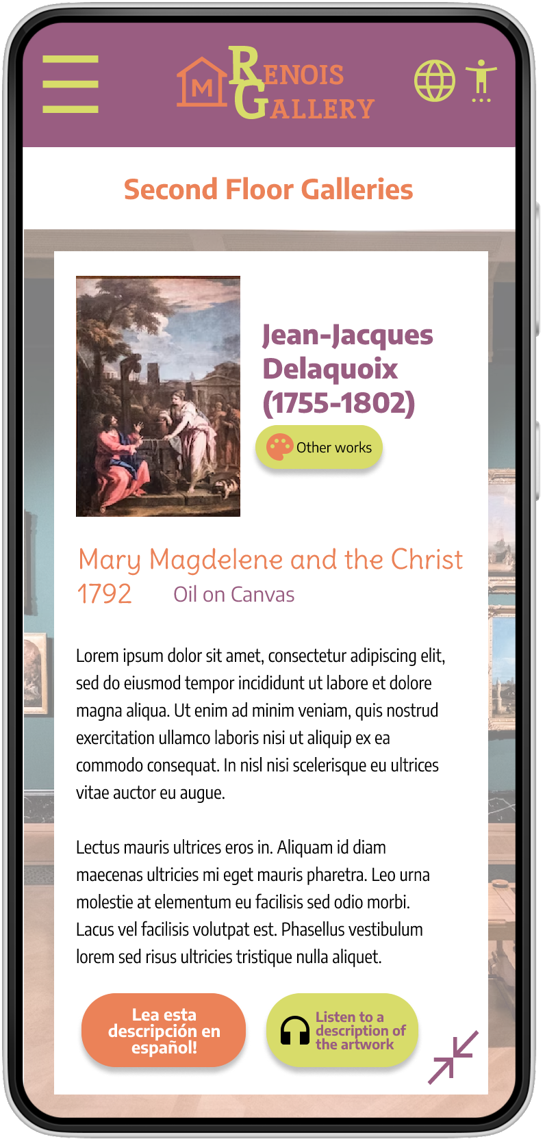 To expand accessibility, I added new buttons to offer Spanish and audio versions of the artwork. This was a popular feature from the moment it was added in usability testing.