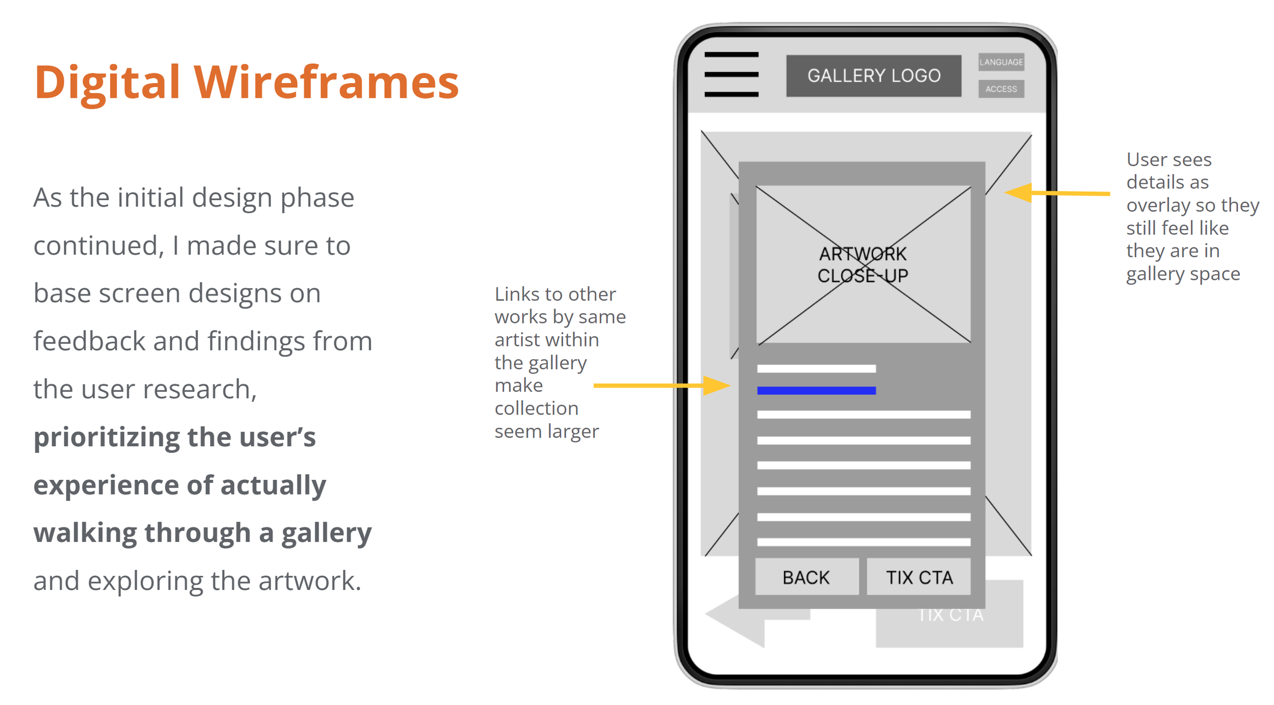 I did several quick ideations exercise to come up with ideas for how a user would interact with each page. For example, brainstorming exercises revolved around how to show additional information about specific artworks. I focused on making the user feel like they were physically touring a gallery and walking up to a piece of art.