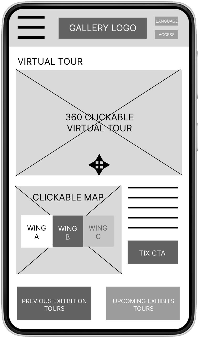 Taking the time to draft iterations of each screen of the app on paper ensured that the elements that made it to digital wireframes would be well-suited to address user pain points. For the virtual tour homepage, I prioritized a offering multiple navigation routes with maps and images.