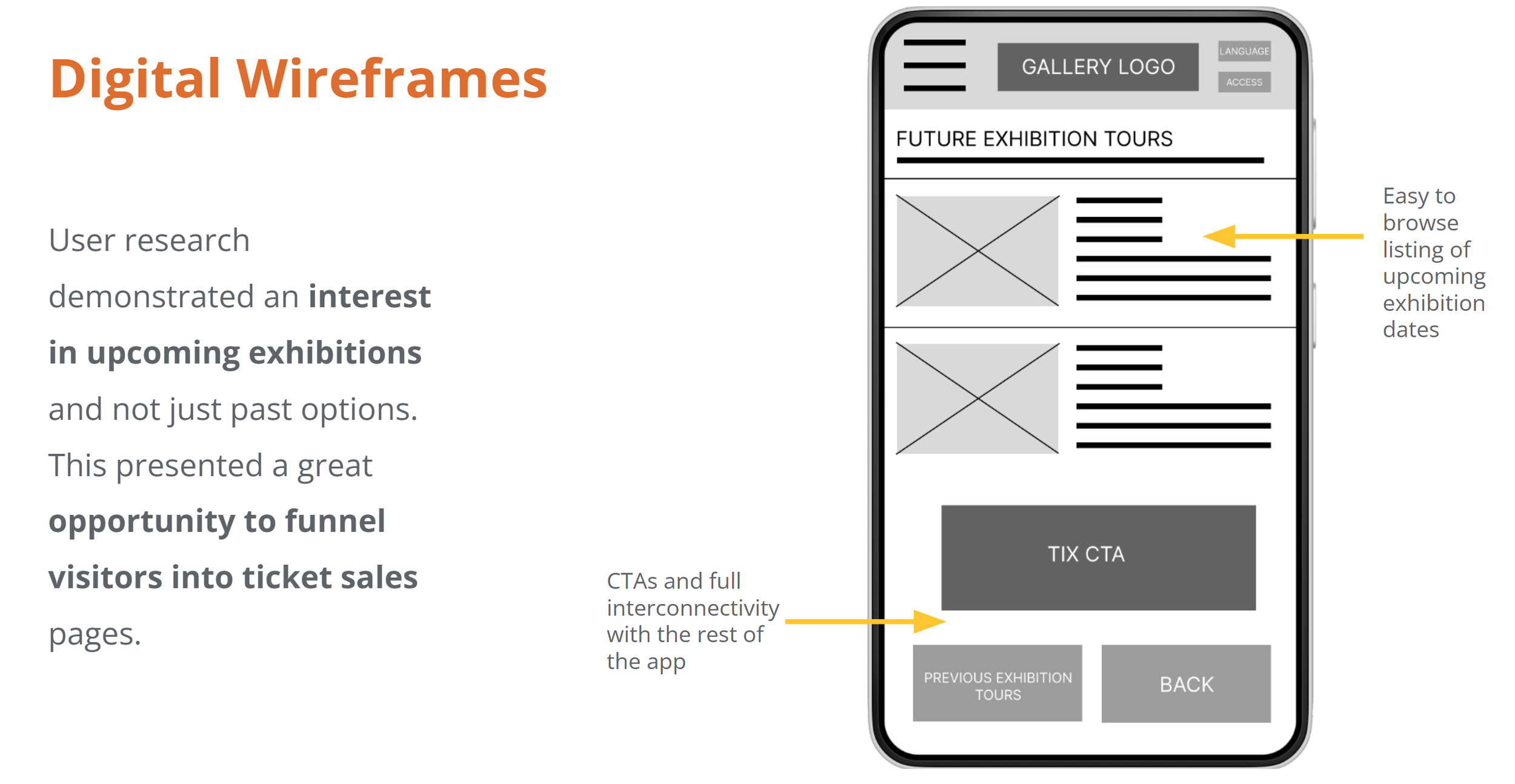Initial user research and testing showed that users also wanted to see future exhibitions in the same format: at the time, future exhibitions were only being presented in newsletters to subscribers, or in press releases.