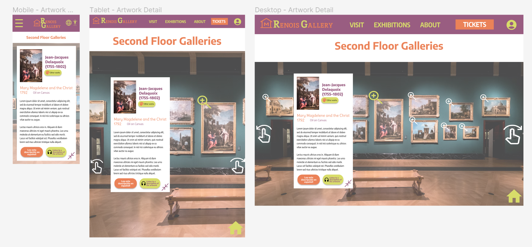 With the app designs completed, I started work on designing the responsive website. The designs for screen size variation included mobile, tablet, and desktop. I optimized the designs to adjust the overlay to make sense within the overall gallery.